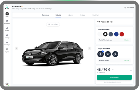 Firmenwagen zu bestellen ist zeitaufwändig und oft intransparent. Mit dem RONYA CarConfigurator konfigurierst du dein Wunschfahrzeug online, siehst sofort verfügbare Rabatte aus RONYA Rahmenverträgen und bestellst mit wenigen Klicks. Kein Verhandlungsmarathon mit Händlern. Einfach konfigurieren und von Großkundenkonditionen profitieren. mehr erfahren